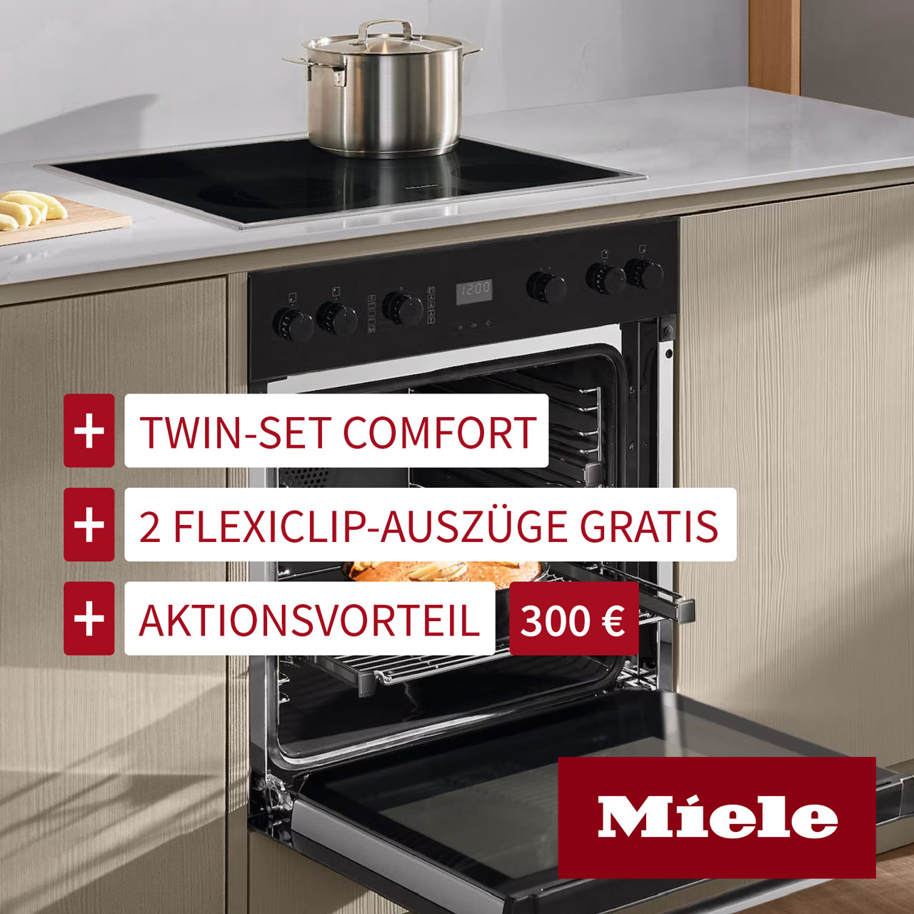 Das Miele TwinSet Comfort bestehend aus Herd H 2459-1 E und Kochfeld KM 6003 jetzt zum Aktionspreis